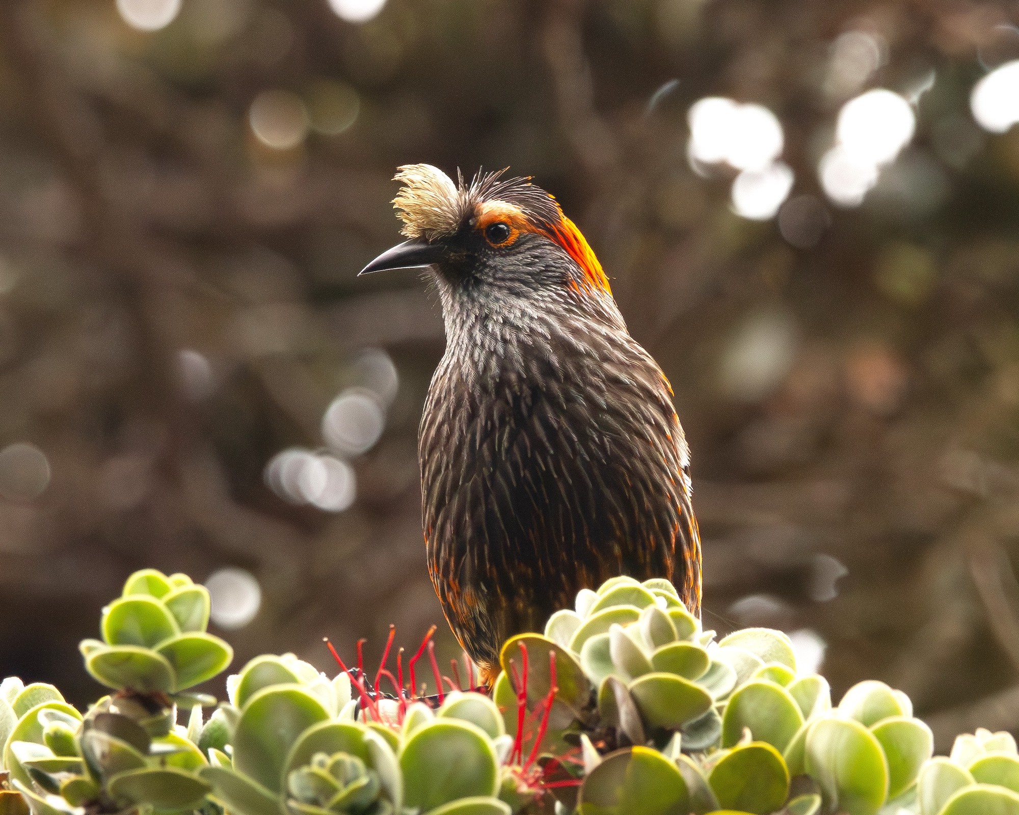The rare (critically endangered) and ornate ʻākohekohe, or Crested Honeycreeper, is one of the largest honeycreepers, measuring over 7 inches, and also one of the most distinctive. ‘Ākohekohe are uniformly dark with silver flecks on the face and upper breast, white-tipped tails and wingtips, and have bright orange napes and eye patches. The white crest on their foreheads is the source of their English name. ‘Ākohekohe fiercely defend nectar sources and are often seen chasing other birds out of ‘ōhi‘a trees. With their exceptionally long legs, they typically run across the treetops between blossoms and are seen doing very acrobatic twists and splits to reach flowers. ‘Ākohekohe exist in pristine native forests above 5,700 ft in elevation making them the most range-restricted species on Maui.