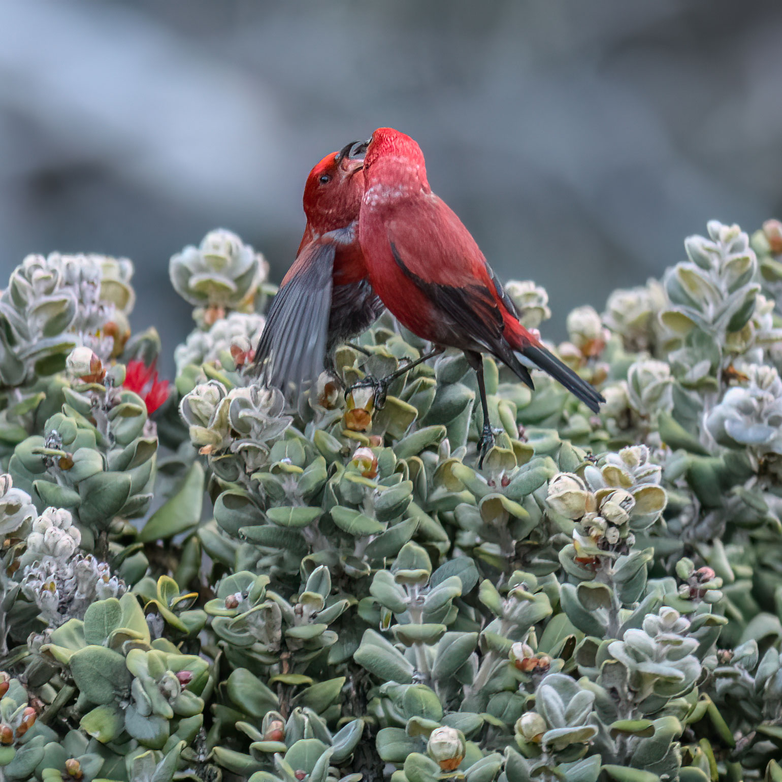 ʻApapane are found around flowering trees, particularly ʻōhiʻa lehua. They often perch conspicuously on the outer clusters of flowers to feed on nectar with brush-tipped tongues and assist with ʻōhiʻa pollination. The tail is characteristically cocked up. Small flocks of ‘apapane frequently fly high over forested ridges.