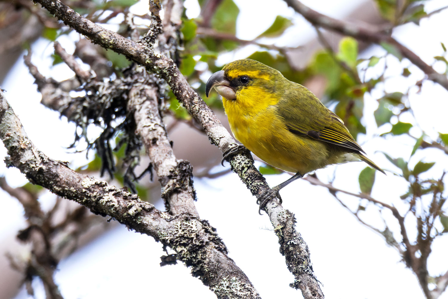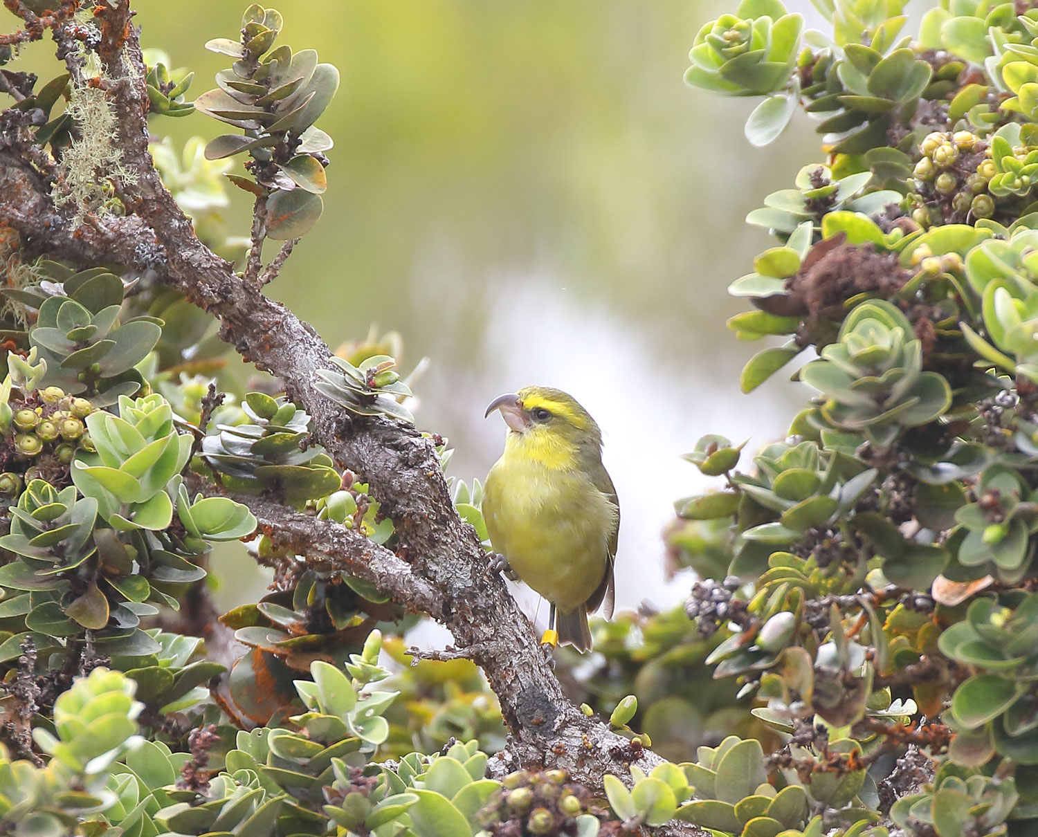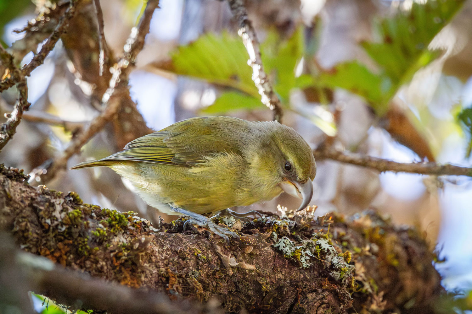 Kiwikiu or Maui Parrotbill use their large parrot-like beaks to split branches and to extract insect larvae, their primary prey. Adult kiwikiu are 5 to 6 inches long, olive-green above and yellow below, and have short tails and distinctive yellow eye-stripes. Females tend to be less colorful and have smaller bills than males. Immatures are greyish-olive above and pale yellow below with whitish eye-stripes.