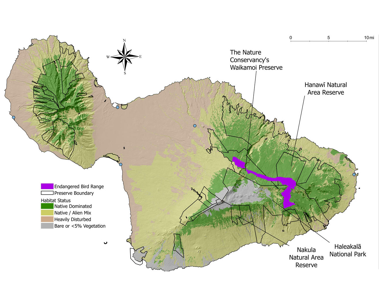 ‘Alauahio are extinct on Lāna’i and extirpated from West Maui, and now remain only on East Maui. They are fairly common on forested slopes of Haleakalā above 4,500ft, but still have a small population (~60,000 individuals) being a single island endemic.