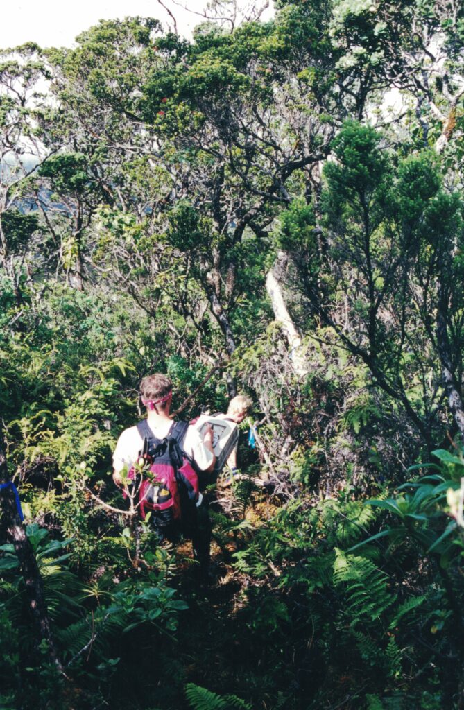 After this, in 2002, biologists launched an ambitious effort to bring the birds together. A female Poʻouli was translocated across the mountain into the male’s territory. She was fitted with a radio transmitter and released near his known roosting site. Unfortunately, by the next morning, she was slowly making her way back to her original home range. A pair did not form.