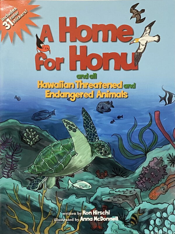 “A Home for Honu and All Hawaiian Threatened and Endangered Animals” features 24 coloring pages and colorful stickers that will lead you into the world of Hawaii’s endangered animals. Learn about honu and monk seals in the sea along with iiwi and other birds highin mountain rainforests. See how important it is to help protect these creatures for generations to come.